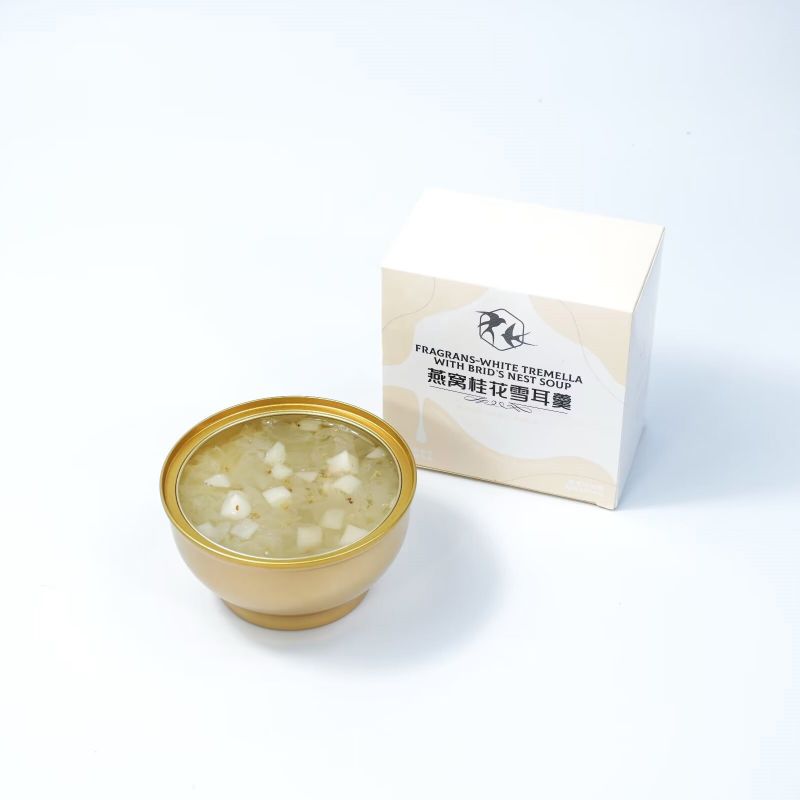 フレグランス ホワイト トレメラとツバメの巣のスープ。この絶妙なスープは、さわやかな雪茸、栄養を与えるツバメの巣、香り豊かなキンモクセイを巧みに組み合わせています。コラーゲンたっぷりの最高級雪茸を使用し、肌や体に潤いと栄養を与えます。スープに添えられた甘い香りのキンモクセイが全体に香ばしい香りをもたらし、また違った味わいを楽しめます。